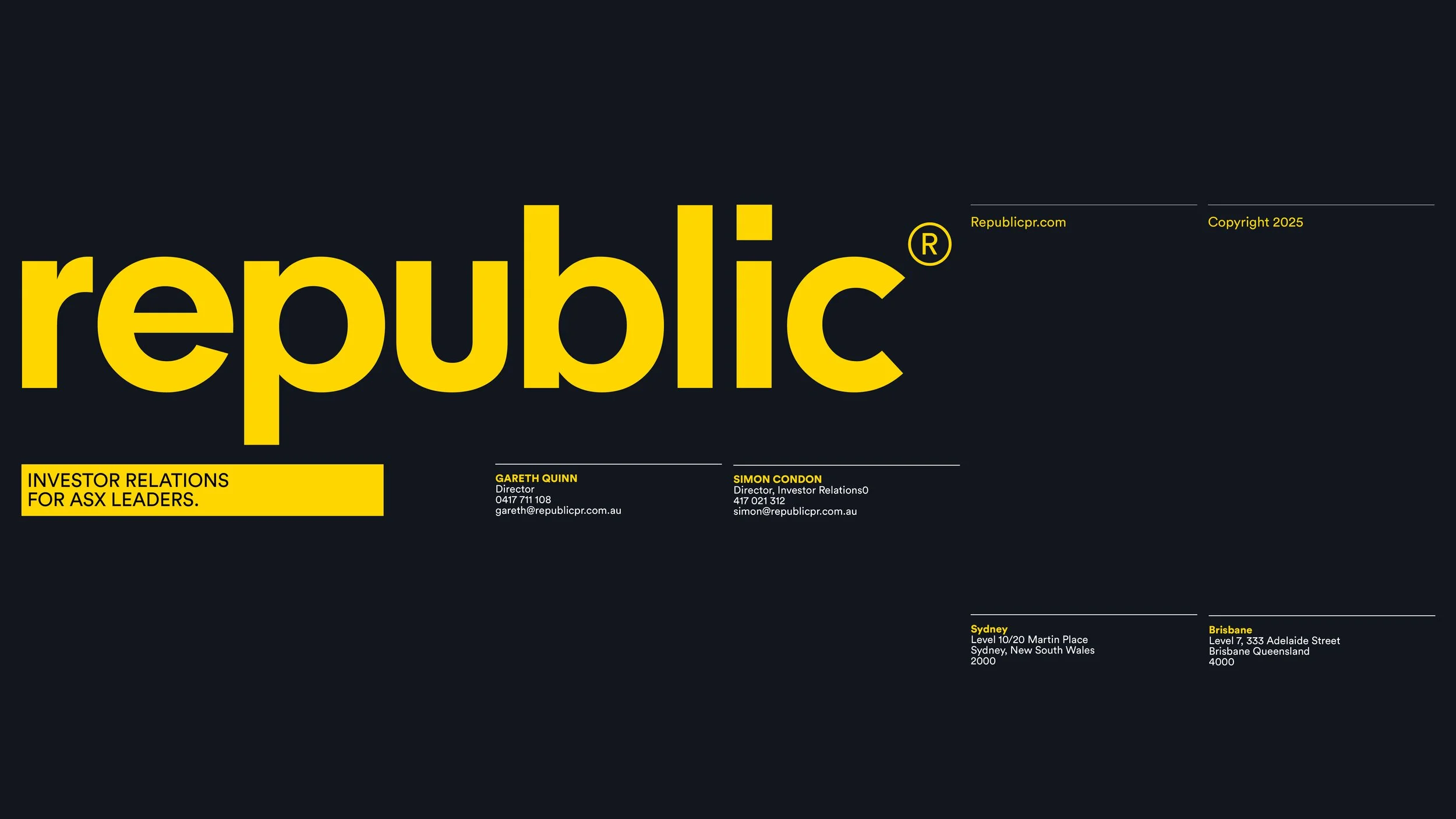 Republic IR is a Brisbane-based investor and media relations firm that helps ASX-listed companies elevate their market presence through strategic communications. Founded in 2013 by Gareth Quinn, the company offers services across investor relations, media engagement, digital marketing, capital raising, and corporate storytelling. Republic IR works closely with listed businesses to enhance shareholder communication, support IPOs and M&A activity, and craft compelling narratives for both investors and the public.